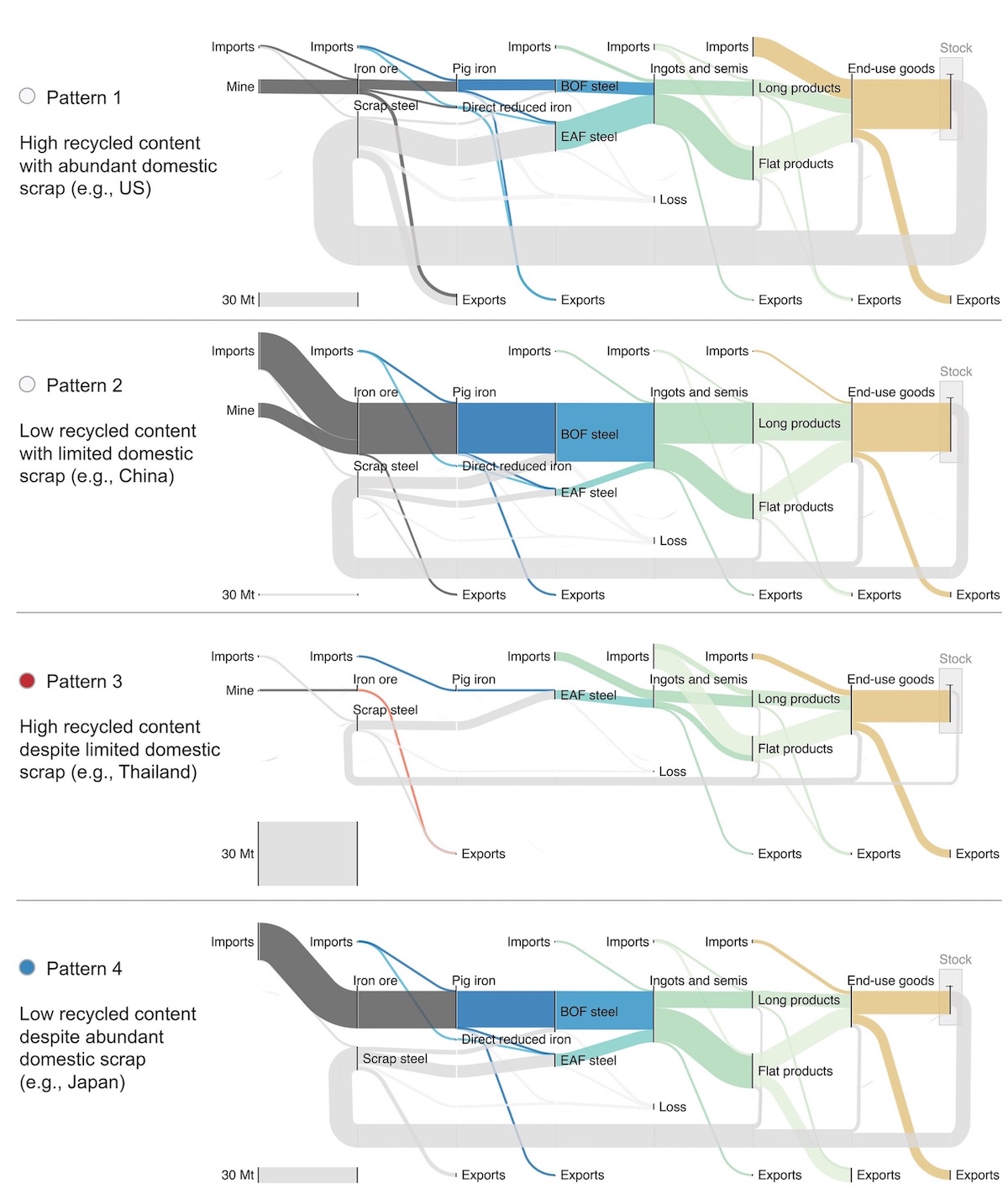 パターン1:豊富な国内スクラップと整合的に、高いリサイクル材割合を有する国(米国等)