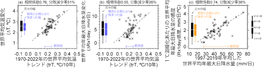 当研究チームは、Rx1day感度は現在のRx1dayの平均値と強い正相関(0.74)を持つことを発見しました(図1c)。つまり、現在のRx1dayが大きいモデルほど、1℃温暖化当たりのRx1dayの増加量は大きくなります。横軸は観測可能な量なので、観測値と比較することで、Rx1day感度の分散を36%減らすことができました。