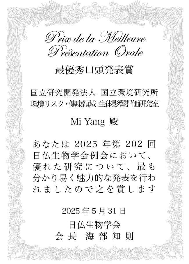 MI Yang 特別研究員が日仏生物学会より最優秀口頭発表賞を受賞