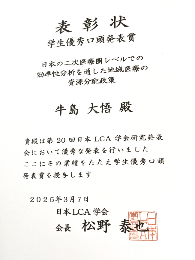 受賞対象: 日本の二次医療圏レベルでの効率性分析を通した地域医療の資源分配政策, 第20回日本LCA学会研究発表会, 2025