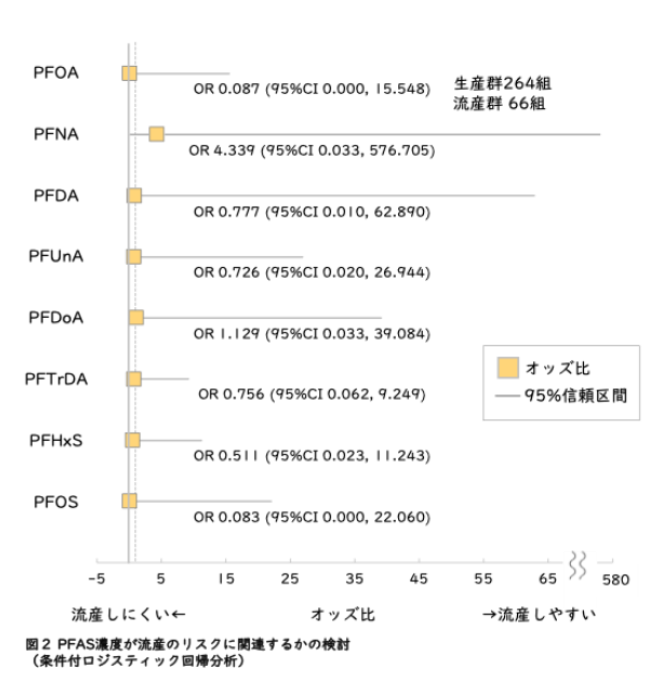図2:PFAS濃度が後期流産に関連するかを調べましたが、統計学的な関連性は見られませんでした(条件付きロジスティック回帰分析)。