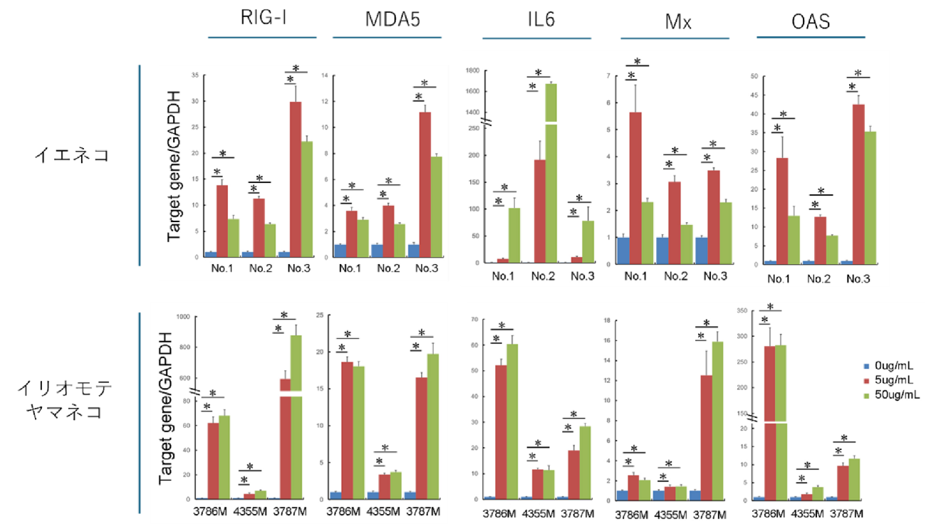 ウイルス類似物質をイエネコおよびイリオモテヤマネコの皮膚由来の細胞にばく露したところ、RIG-IおよびMDA5遺伝子の発現が両種とも上昇することが確認されました(図1)。また、両種とも、RIG-IおよびMDA5遺伝子の発現上昇により発現が誘導される遺伝子である、炎症性サイトカイン遺伝子(IL6)や、抗ウイルス遺伝子(MxやOAS)においても発現の上昇が確認されました。これらの結果から、イエネコおよびイリオモテヤマネコの皮膚由来の細胞で、RIG-IおよびMDA5を介して、ウイルス類似物質を認識して、細胞内で応答していることが確認できました(図1)。
