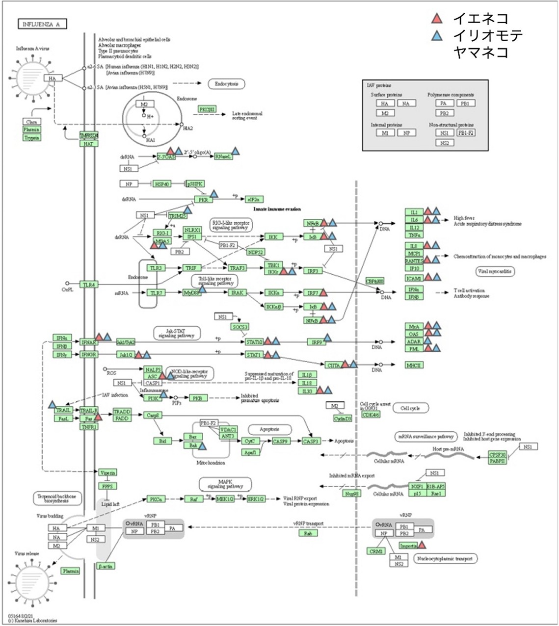 インフルエンザに関する経路に関して、ウイルス類似物質をばく露後、大きく発現が変動した遺伝子の多くは、イエネコとイリオモテヤマネコで共通でした(図3)。