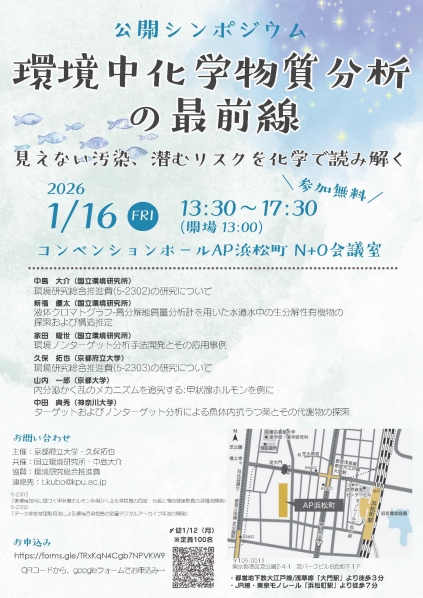 京都府立大学と国立環境研究所は、一般市民向けの公開シンポジウム「環境中化学物質分析の最前線 見えない汚染、潜むリスクを化学で読み解く」を以下の要領で開催します。