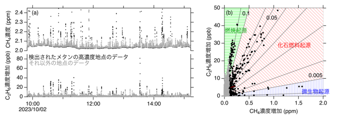 当研究チームは、メタン(CH4)とエタン(C2H6)を同時に測定可能なガス分析計を中心とした車載観測システムを構築しました。車両の前方下部から試料空気を吸引して常時1秒間隔でメタンとエタンの濃度を計測します。車両に搭載したGPSのデータから、観測された高濃度地点の場所が特定できます。この車載観測システムを搭載した自動車は、2023年の9月から10月にかけて、東京都市圏を広く計2000km以上走行し、これらの観測データの解析によりメタンの高濃度地点が特定されました。さらに、メタンの高濃度地点におけるエタン濃度の変動を合わせて解析し、メタンの高濃度が化石燃料起源か微生物起源かを分類しました。化石燃料の一つである都市ガス(天然ガス)は、メタンを主成分としますが、一定の割合でエタンを含むため、都市ガスの漏出はメタンとエタンの同時高濃度として検出されます。一方、廃棄物処理(埋立処分場、排水処理場、下水管など)に関連して排出されるメタンは微生物が生成するもので、通常はエタンの排出を伴いません(図1)。また、メタンは有機物の不完全燃焼でも発生しますが、そのような燃焼起源の排出は、上記の化石燃料起源と微生物起源に比べて非常に小さいことが本観測からわかりました。このように分類したメタン排出地点(高濃度地点)を都内の地域別に解析し、地域別の排出源の特徴を調べました。