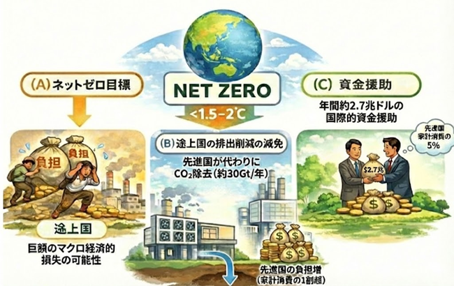 (B)途上国の排出削減の減免:途上国の排出削減を一部免除し、先進国が代わりに排出削減を担う場合、世界全体で年間約30ギガトン(Gt)のCO2を大気中から回収して貯留する「二酸化炭素除去(CO2除去)」が必要となり、その費用は先進国の家計消費の10%を超える規模に達する