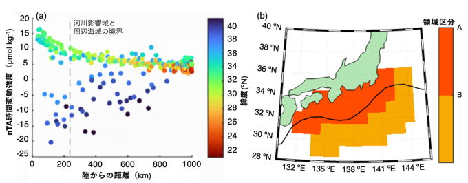 (a):対象海域におけるnTAの時間変動パターン強度と陸からの距離の関係。点線は強度の減衰率が変化する距離を示しており、これを河川水影響域と推定した。(b):河川水影響域(エリアA)と比較のための周辺海域(エリアB)。曲線は通常時の黒潮の流路。