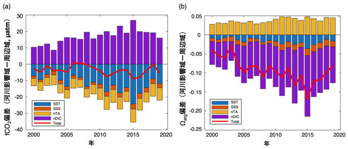 次に、海洋酸性化の指標の一つであるアラゴナイト飽和度(Ωarg)偏差の推移を見てみると、fCO2偏差とは異なり、河川影響域は周辺海域よりΩargが低く、さらに過去20年の間に平均で0.09 ± 0.01 低下(酸性化)したことが分かりました(図2b)。これは、河川水流入による海水温の低下と有機物分解等によるDICの供給により、河川影響域の方が周辺海域に比べてΩargが低下して酸性化がより進行したためです。一方,河川水が供給するnTAによって、平均で酸性化を71%に緩和していたことが示唆されました。