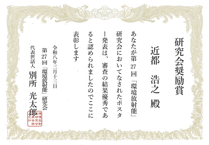 近都 浩之 研究員が「環境放射能」研究会より研究会奨励賞を受賞