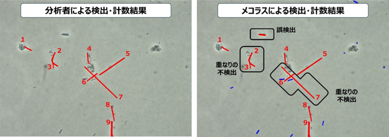 図1に精度の評価例を示しました。2本の繊維が重なった集合体が2つ(番号2・3および6・7)ありますが、検出精度ではこれらを個別に識別せず1つとして扱います。この例では7つの繊維集合体すべてを検出しているため再現率は1.0となり、メコラスが検出した8個体のうち1個体が誤検出であるため適合率は 0.88 になります。計数精度では重なった繊維も個体識別し、4本としてカウントします。計数対象繊維9本のうち、メコラスは重なりを識別できず7本と計数したため再現率は 0.78 となり、検出した8本のうち1本が誤検出であったため適合率は 0.88 になります。