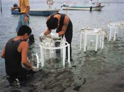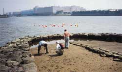 また,平成12年度に「沿岸域環境修復技術の生態系に与える影響及び修復効果に関する研究」の課題で,自然に近い状態の生態系と修復を試みられた生態系の違いを明らかにすることにより,修復技術の効果を調査する研究を開始しました。2001年の組織改正(独立行政法人化)に伴い,この研究課題は,重点特別研究プロジェクト「東アジアの流域圏における生態系機能のモデル化と持続可能な環境管理」に統合され,その一つの課題「沿岸域環境総合管理に関する研究」(平成13〜17年度)として継続されています。この課題では,沿岸域環境を改善するための修復方策の効果を検討するために,沿岸域環境の変動予測モデルを開発し,環境影響評価にも役立つよう,沿岸域環境管理のための手法を提示することを目的としています。