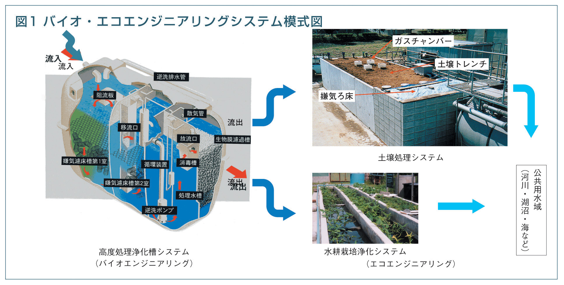 Q:しっかりした排水処理システムが必要なことはよくわかります。でも開発途上国では下水道など大規模なシステムの導入は資金的にも厳しそうですね。稲森:開発途上国では低コストでかつ省エネルギー,省メンテナンスな技術が求められています。下水道のような大規模集約型の施設よりも浄化槽のような小規模分散型の施設の方が適していると思います。そこで,バイオ・エコエンジニアリングの活躍の場が出てくるのです(図1参照)。