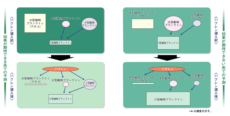 一方、「効果が期待できない系」は、アオコはそれほど多くなく、大型動物プランクトンが多い環境です。ここにハクレンを導入すると大型動物プランクトンがハクレンに食べられ減るため、トロフィック・カスケード効果により小型植物プランクトンが増え、結果的に植物プランクトンの総量はハクレンを導入する前と変わらなくなるか、もしくは、増える場合もあります。そのため透明度は回復しません。