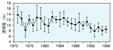 十和田湖では、重要な水産資源であるヒメマスの漁獲量が1985年に急に落ち込み、それに代わって80年代前半に予期せずに導入されたワカサギの漁獲量が増えました(図2)。また同じ頃から湖の透明度が低下し(図3)、COD濃度が高くなっていることが明らかになりました。そこでワカサギの増加がヒメマスの減少や水質の悪化にどのような影響を及ぼしているかを調査しました。