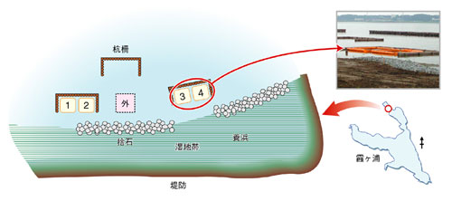 2003年1月から自然再生推進法が施行され,国土交通省は霞ヶ浦数カ所で湖岸植生帯の復元事業を行っています。日本では過去30年間に富栄養化や護岸工事などさまざまな人為的影響により,浅い湖沼では水生植物群落とそこに生息する生物の数が著しく減少し,生態系の劣化が深刻な状況になっています。とくに沈水植物群落は,湖沼生態系の回復の鍵となる重要な生態系要素です。このため東京大学,土木研究所と共同で,この事業の実施カ所の一つである霞ヶ浦高浜入り石川地区に実験隔離水界を設置し,魚を除去するバイオマニピュレーションを実施して,土壌シードバンクから沈水植物群落を再生させる技術について検討を始めています(図5)。また,こうした実験隔離水界を用いて沈水植物群落の役割や機能を評価していく研究を進めます。