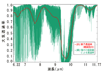 物質はすべてそれ固有の波長の光や熱を吸収する性質を持っています。そうですね,赤い花を頭に浮かべてください。可視光が当たると赤い色以外の光を吸収し,赤い色を反射するので,私たちは反射して目に入った赤を認識し,「赤い花」だとわかるのです。ILASは太陽光線を分光(プリズムが太陽光を虹の7色に分割するように波長別の光に分けること)して観測します。ターゲットのオゾン,メタンなどが大気中にあれば,それ固有の波長のところに光の吸収(吸収線)が現われますら,成分ごとの濃度がわかります。ILASの観測する赤外波長帯(6〜12μm)の範囲にはいろいろな物質の吸収線が数十万本もあります。これらの1本1本について吸収量を計算します(図1緑線)。さらに観測装置特性などを含めて計算して出てきた結果がこのスペクトルです(図1赤線)。吸収線の数が非常に多いことからもこれを得るまでにはたいへんな計算が必要なことがおわかりと思います。それらをいかに精度を落とさず,しかもむだなくスムーズに計算していくかを考えるのが計算アルゴリズムのプログラミングの技術です。アルゴリズムは常に進歩していかなければなりません。