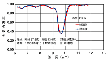 Q:どのように進歩していくのですか。横田:たとえばILASが最初に観測した1996年9月18日の赤外観測スペクトルですが(図2),観測したものが赤,計算したものが青で示されています。けっこう一致しているように見えますが,少しずれている部分もあります。この解析によって求めたオゾンや硝酸の濃度は他の手法の方法で観測したデータと比較的よく一致していましたが,二酸化窒素や水蒸気については思いもよらない値が出てしまいました。対応に四苦八苦していたとき,当時プロジェクトに招へいしていたアメリカ・デンバー大学のBlatherwick博士から「6μm付近に酸素の吸収があるはず」と指摘され,アルゴリズムを修正して計算したところ,水蒸気と二酸化窒素の解析結果が格段によくなりました。さらに数年後,水の連続吸収に関する新しい理論式をアルゴリズムに取り入れたところ,低い高度での二酸化窒素のデータがさらによくなりました。気体による光の吸収量を計算するための,室内実験に基づく吸収線に関するデータも年々改訂されています。このように,理論を現実に近づけるためにはバージョンアップの作業を続けていく研究が必要となります。この一つひとつが進歩といえます。