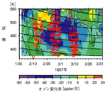 図3 ILAS観測によって明らかになった1997年初期の北半球高緯度でのオゾン変化率