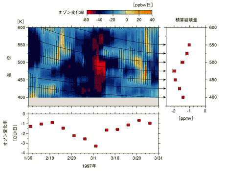 2月下旬には、温位で450Kから500K(高度で約18km〜20km)で平均オゾン濃度変化率が最大50-70ppbv/日に達しています(中央赤い部分)。また、1月30日から3月31日までの間に、オゾン濃度は最大で2.0ppmvも減少しました(右図)。1月30日の高度20km付近での極渦内平均オゾン濃度は3.6ppmvであったことから、この2カ月間で約55%のオゾンが化学的に破壊されたことになります。1月30日から3月31日の間に、400Kから600Kの範囲で積算したオゾン減少量は96DUでした。