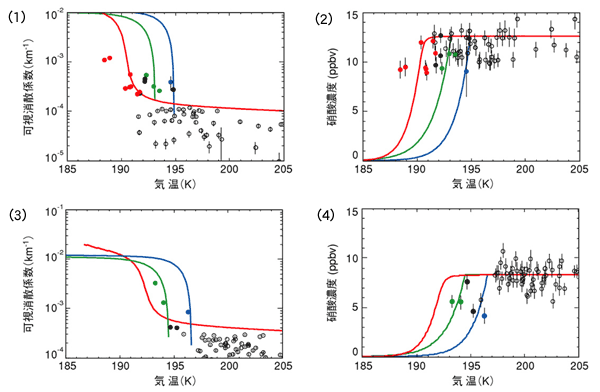 これらの3つのタイプの粒子は各々独自の熱力学的な特徴を持っています。実験室データから予測される気温と消散係数および硝酸ガス濃度との理論的関係を図中に実線(青:NAT、緑:NAD、赤:STS)で示します。