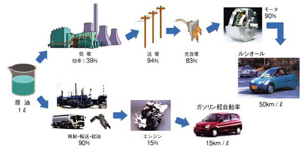 環境面での性能については,図2に示したように原油1ℓから得られる火力発電量に置き換えると,市街地(一般的に燃費を表わすのに使われる10・15モード)で1ℓ当たり50kmの距離を走行できます。これは同クラスのガソリン軽自動車に比べ3倍以上高い工ネルギー効率に相当します。