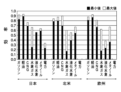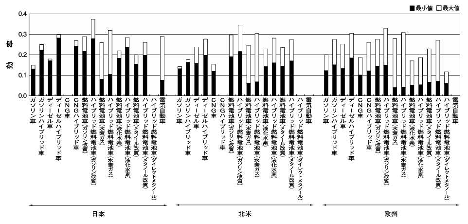自動車の環境負荷を総合的に評価するには,自動車を直接利用する際の環境負荷に加え,利用するために必要な燃料の生産から供給までの,いわゆるエネルギーチェーンサイクル全体の環境負荷を評価することが必要になります。この評価手法はWell-to-wheel 分析と呼ばれ,自動車関連の研究分野ではすでに数多くの評価事例が報告されています。研究では,この評価手法を用いて燃料と車輌の駆動方式ごとにエネルギー効率の評価を行いました。また地域によるエネルギー効率の違いを明らかにするため日本,北米,欧州の3地域別の評価も行いました。