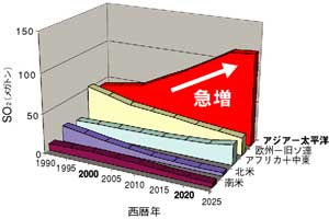 図1 化石燃料使用量の増加によるSO2発生量の予測(AIMより)
