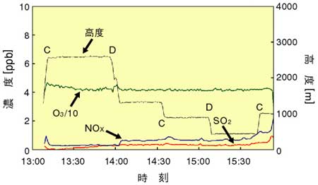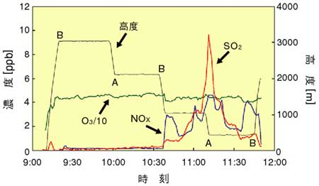 Q:次に航空機観測についてお聞きします。航空機観測は,ある高さの大気を採取し分析するのでしょうが,その意義を教えて下さい。畠山:航空機観測のデータについて,たとえば硫黄化合物でいえば,SO2と硫酸塩の両方を測りそれぞれに含まれる硫黄(S)の比を調べます。SO2は輸送中徐々に酸化され硫酸となります。つまり,SO2の比が高ければ発生源にかなり近い汚染物質ということになり,逆に硫酸性のSの濃度が高ければ,酸化が進んできていることから長距離輸送されていることがわかります。