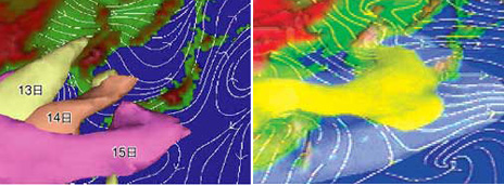 今回の研究で九州大学応用力学研究所の鵜野教授と共同で開発した酸性雨長距離輸送モデルは,酸性雨をもたらす大気汚染物質の輸送される様子を3次元でシミュレートできます。結果がビジュアルに表現できるため,広域大気汚染の輸送経路,広がりが具体的に理解できます。大気汚染物質の移動形態としては,「つの」型,「巨大パフ」型がありますが,それをこのモデルで紹介します。