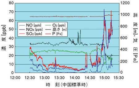 搭載した測定器はガス測定器(オゾン,NOx,SO2),PM2.5およびPM10サンプラー(採取装置),電子顕微鏡分析用インパクター(粒子捕集器)です。