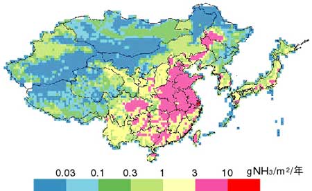 その結果,SOx(図6)やNOx(図7)は,経緯度0.5度のグリッドごとの差異が大きく,地域による発生量の違いが目立ちました。一方,NMVOCは南方に行くほど発生量が多く,アンモニア(図8)は家畜排泄物が寄与することから中国中央部で発生量が大きいことがわかりました。