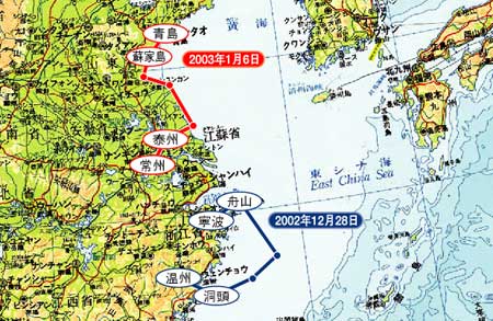 観測は2002年12月から2003年1月にかけて中国の寧波ー温州間,上海ー青島間において行いました。ここではその中から12月28日と1月6日の観測結果を紹介します。