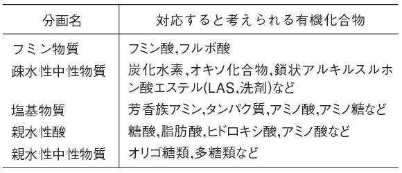 今回の研究では,難分解性溶存有機物をフミン物質,疎水性中性物質,塩基物質,親水性酸,親水性中性物質の5つに分け(分画),それぞれの特性などを調査しました。5つの分画成分に対応すると考えられる主な有機物質は右の表のとおりです。
