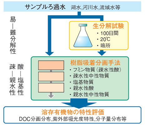 次に吸着されなかった親水性の物質を陽イオン交換樹脂に通すと塩基物質が吸着されます。続いて陰イオン交換樹脂で親水性酸が吸着され,残った液に親水性中性物質が分画されます(10ページ図4参照)。塩基物質には疎水性と親水性の塩基物質が含まれますが,疎水性塩基物質は無視できるほど少ないことがわかっています。こうして分画したものについて,有機炭素量や分子量分布,吸光度や蛍光強度を測ることで特性が評価できます。