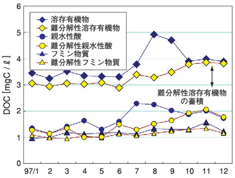 図3 霞ヶ浦湖心における溶存有機物および難分解性溶存有機物の動態(1997年)