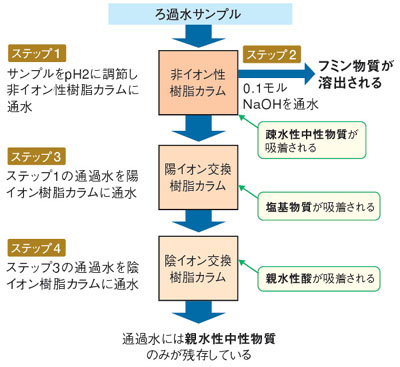 樹脂吸着分画手法では,非イオン性樹脂,強酸性陽イオン交換樹脂,強塩基性陰イオン交換樹脂の3つを用います(図4)。これにより溶存有機物は,フミン物質,疎水性塩基物質,疎水性中性物質,親水性酸,親水性塩基物質,親水性中性物質の6つに分画されます。ただし,多くの天然水や排水サンプルには疎水性塩基物質がほとんど存在しないことがわかったことから,研究では分画の手順を効率的で汚染されにくくするため,疎水性塩基物質と親水性塩基物質をまとめて塩基物質とし,5つに分画する手法を確立しました。