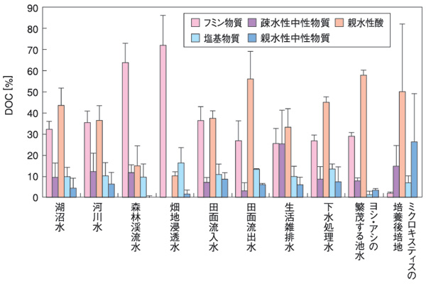 これらの実験は,易分解性—難分解性の区別を行っていない生分解試験前のものですが,同様の実験を生分解試験後のサンプルについても行ったところ,生分解試験前と同様にすべてのサンプルでフミン物質と親水性酸が卓越していることがわかりました。このような結果から,湖水や河川水,流域水中の難分解性溶存有機物はフミン物質と親水性酸であることが明らかになりました。