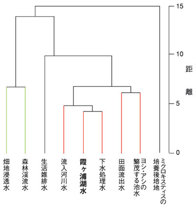 さらに,霞ヶ浦湖水の溶存有機物分布がどのサンプルに類似しているかを明らかにするため,サンプルを類別化する統計的な手法であるクラスター解析を行いました。その結果,溶存有機物分画分布に関する限りでは,湖水にもっとも近いのは下水処理水であることもわかりました(図6)。