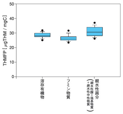 フミン物質がトリハロメタン生成の主要な原因物質であるかどうかを明らかにするため,霞ヶ浦湖水の溶存有機物,フミン物質,親水性画分(親水性酸+塩基物質+親水性中性物質)についてトリハロメタン生成能(THMFP)を測定しました。