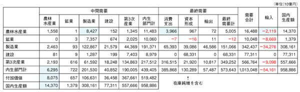 表をタテの列方向に読むと,表頭の各産業の生産に要した費用の構成(投入),つまり生産のための原材料(これを中間投入と呼びます)をどの産業からどれだけ買ったか(いくら支払ったか)がわかります。さらに,企業の利潤など,生まれた価値(付加価値)も分かるようになっています。たとえば農林水産業は,約14目4兆円を生産するのに,約6.3兆円の原材料やサービスを購入し.8兆円余りの付加価値を生み出しています。製造業から約2.5兆円分を調達していますが,これには肥料や農薬,ビニールハウスなどの資材,農業機械の燃料などが含まれます。