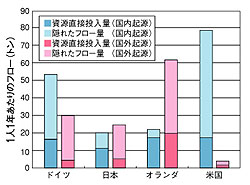 そして,そこで国際共同研究を始めようということになったのです。日本,アメリカ,ドイツ,オランダの4カ国が参加し,1997年に第1回の成果を発表しました。この研究では,自然環境から経済活動への資源のインプット(投入)フローの把握に重点を置きました。その大きな特徴は,従来とらえてきた資源のフローだけではなく,それまで表に現われてこなかった「隠れたフロー」を推定し,初めてその国際比較を行ったことです。