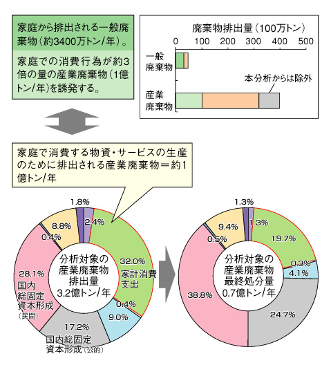 私たちが日常生活から出す廃棄物以外に,暮らしを支えるさまざまな産業からも廃棄物が出ます。さらに各産業の廃棄物は,自らの生産活動から直接出るものと,使用するエネルギーや原材料などを供給する他の産業から間接的に出るものがあります。本研究の主な目的は,こうした廃棄物の発生構造を,需要の側から分析することにあります。すなわち,どのような消費財(日用品や家電など),資本財(産業用機械や建築物など)の生産活動が,原材料の使用などを通して産業廃棄物の排出量および最終処分量に直接・間接に影響を与えているかを定量的に明らかにすることです。分析の結果では,私たちの生活に関連した産業廃棄物の方が家庭から直接出しているごみよりも多いことがわかりました。