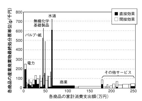 図5は,横軸に各商品の一人当たりの家計消費支出額,縦軸に各商品・サービスの消費支出千円当たりの産業廃棄物処分量(g)を表わしたものです。各商品の横幅と縦幅を掛けた面積が,当該商品・サービスの消費によって誘発した最終処分量を表わします。縦長の長方形になる場合は,家計消費の金額が小さい割に廃棄物の発生量が多く,横長の場合は逆となります。