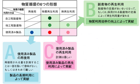 まず使用済み製品の再使用(●)は,たとえば中古家電の売買やリターナブル瓶の再使用などがあります。前者は売買時期や量などを計測することが困難ですが両者共に製品や部品の長期利用によって物質循環の目的に貢献ができます(図中A)。 次に副産物の再生利用では,自工程副産物の物質再生利用(●)として自家発生鉄屑を粗鋼生産の原料に利用する例,他工程副産物の利用では,物質再生利用(●)として製材工場の木くずを紙の原料として利用する例,熱再生利用(●)として製材工場の木くずを燃料として利用する例があります。この利用形態ではどこまでを副産物として定義づけるかによって再生利用量が変わる可能性がありますが,いずれの場合も物質利用効率の向上によって物質循環の目的に貢献できます(図中B)。3つめの使用済み製品の再生利用は,物質再生利用(●)として新聞紙を紙製品の原料として利用する例,熱再生利用(●)として廃プラスチックを燃料として使用する例があります。これらは計測がしやすく定量化が可能で,文字どおり再生利用により物質循環の目的に貢献できます(図中C)。