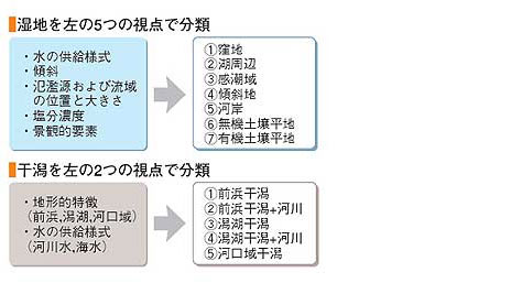 上:米国の湿地、下:日本の干潟(米国の湿地の分類は完成されたもので、現在複数の水文地形学的視点で分類したものが実際に利用されている。一方今回の研究では、日本の干潟を2つの水文地形学的視点で分類した。)