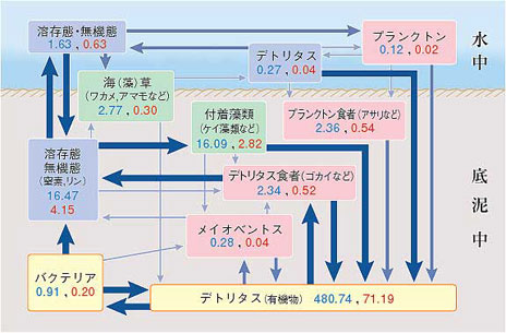 図中の数字は窒素、リンの現存量(mg/L)。矢印の太さはフローの大きさを表わす。