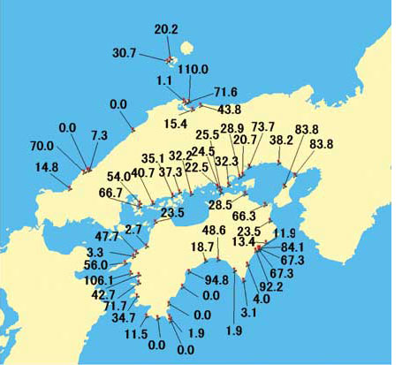 イボニシの全組織中TPT、TBT濃度は、20ng/g湿重を下回る地点が多かったのですが、長崎港、瀬戸内海、鳴門海峡、関門海峡などの地点では、TBT濃度が40ng/g湿重を上回っていました。最高濃度はTPTが174ng/g湿重、TBTは329ng/g湿重でした。兵庫や徳島、高知、愛媛、長崎各県の一部の地点では局所的にTBTの高レベル汚染が見られるなど、いわゆる有機スズ汚染のホットスポットが観察されました。また、イボニシ全組織中のTPT濃度については、おおむね経年的に減少する傾向が見られました。しかし、TBT濃度に関してはさまざまで、緩やかな低減傾向の地域が比較的多かったものの、ほぼ横ばいと見られる地点や、経年的に上昇傾向を示す地点もありました。