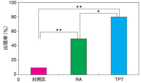 その結果、(2)ではインポセックス出現率が50%と、(1)の10%に対して1%の危険率で有意差が認められ(図4)、ペニス長および輸精管順位においても、それぞれ1%および0.1%危険率で対照区と有意差が見られました。ペニスが伸びた個体では、(3)と同様、最長で6mmを超え、明瞭にその形成ならびに伸長が認められました(図5)。これまでに、インポセックス発症メカニズムを探る種々の実験を行ってきましたが、これほど明瞭にペニス伸張を引き起こした物質はTBTやTPTなど特定の有機スズ化合物以外では9-cisレチノイン酸が初めてです。このような例は文献にも見あたりません。世界規模で見ても9-cisレチノイン酸は初めて確認された有機スズ化合物以外のインポセックス増進作用を持つ物質でした。