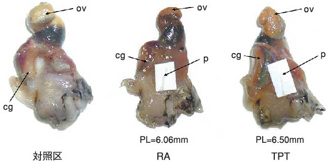 実験は(1)対照区として手を加えていないイボニシ、(2)9-cisレチノイン酸を注射したイボニシ、(3)TPTを注射したイボニシ、の3グループに分け、個々のガラス水槽で1カ月間飼育しました。