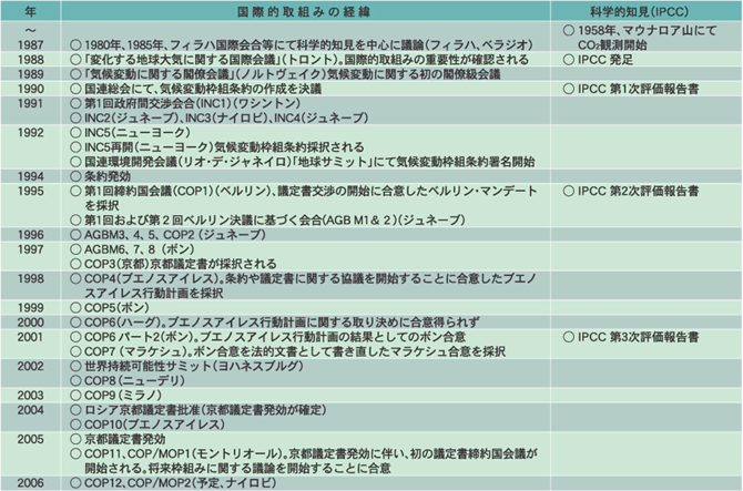 気候変動問題が国際的に取り組むべき問題であると認識されるようになったのは、1980年代後半でした。その後、国際交渉の結果として最初にでき上がったのが1992年に採択された機構変動枠組条約です。しかし、同条約では2000年以降の取組みについて明記されていませんでした。それについて稿和尚した結果が1997年に採択された京都議定書です。その後、京都議定書で承認されたさまざまな国際制度の実施方法等詳細な取決めを検討してきました。